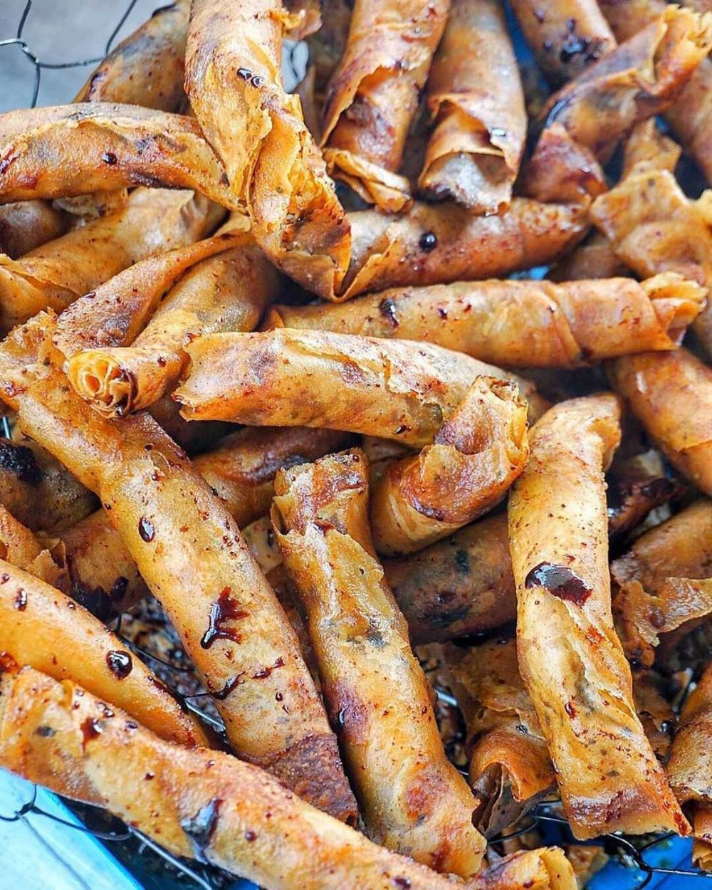 - Ambil kulit lumpia, letakkan pisang, bubuk cokelat, dan gula di atasnya. Gulung dan rekatkan kulit lumpia dengan putih telur.